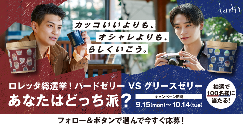 「カッコいいよりも、オシャレよりも、らしくいこう。」のキャッチコピーのもと、ロレッタの大人気アイテムである「ハードゼリー」と新製品の「グリースゼリー」それぞれのアイテムでスタイリングしたビジュアルを展開。ユーザーのみなさまが「自分らしい」スタイルを選択し、抽選で「ハードゼリー」または「グリースゼリー」が当たるキャンペーンになっております。