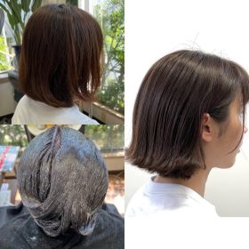 ブリーチ無しの暗めアッシュベージュで赤味を抑えます