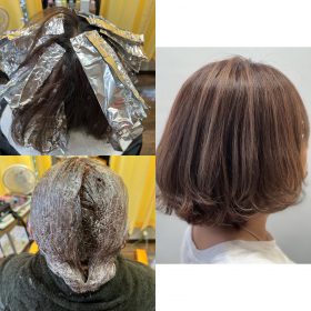 白髪ぼかしハイライトで赤味の少ないミルクティーベージュ