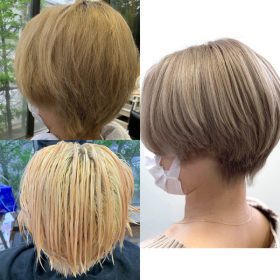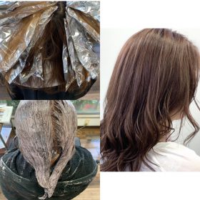 脱白髪染めブリーチハイライトでオシャレなミルクティーベージュに
