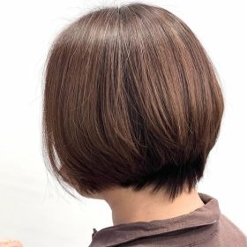 ショートボブにハイライトを活かした明るい白髪染めミルクティーカラーが可愛い