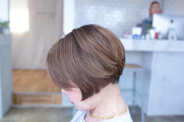 ハイライトのベースにヒロインベージュで染めたショートヘアスタイル