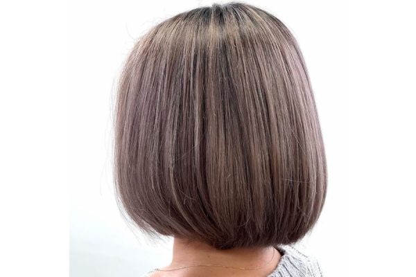 ショートボブにハイライトを活かした明るい白髪染めミルクティーカラーが可愛い