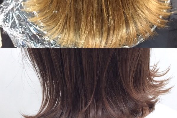 明るい毛束をホイルで残して暗くしたコントラストグレージュ