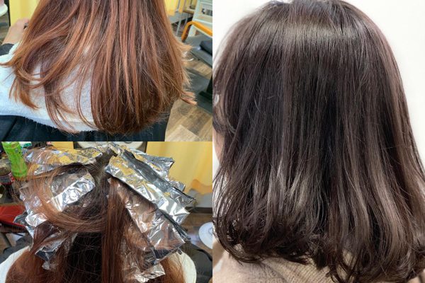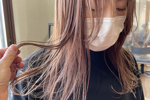ピンクのヘアカラーからブリーチハイライトを使ってグレージュカラーに
