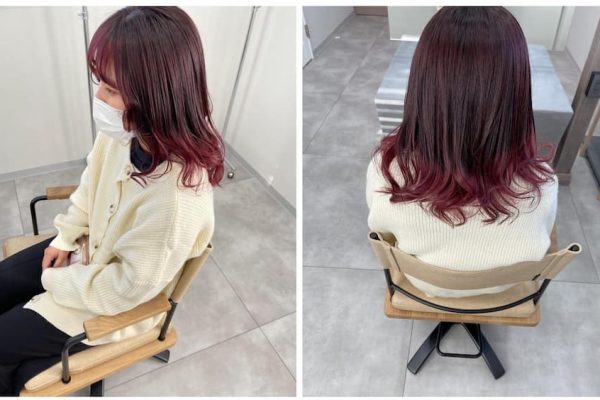 ティントバーで染めたピンクレッドの前髪カラーと裾カラー