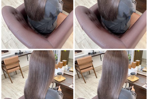 ブリーチ毛にモーブ系のグレージュで染めたヘアカラー