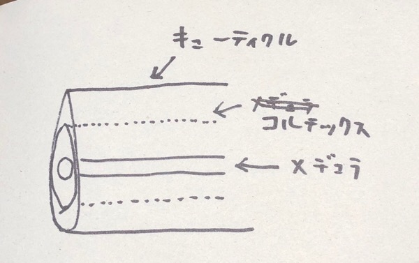 キューティクルを通って、コルテックスに色素が溜まります。