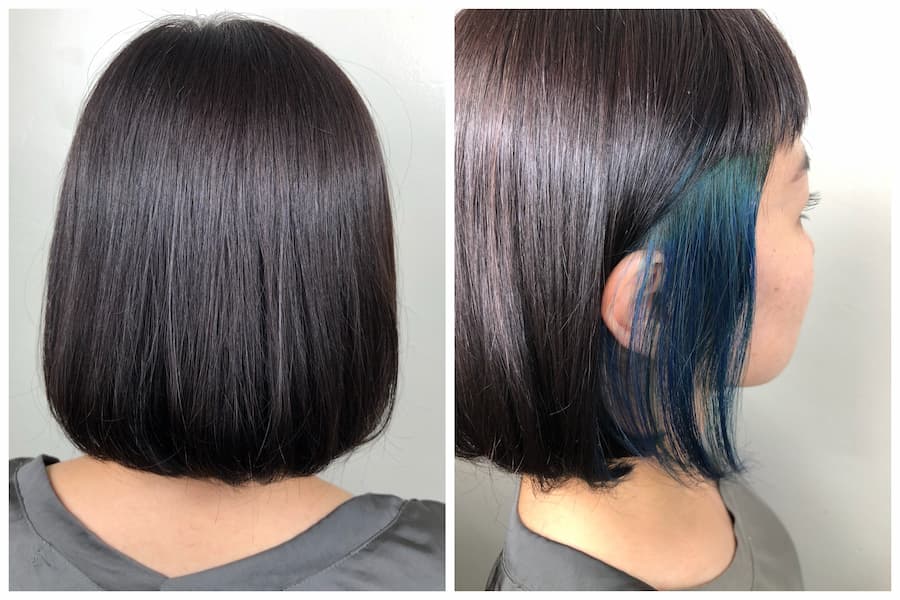 ブリーチのパワーを変えて髪が明るくなるのを調整、そして、ブルーのインナーカラーを、入れると、ブリーチの明るさの違いでブルーとグリーンの色が作れます!