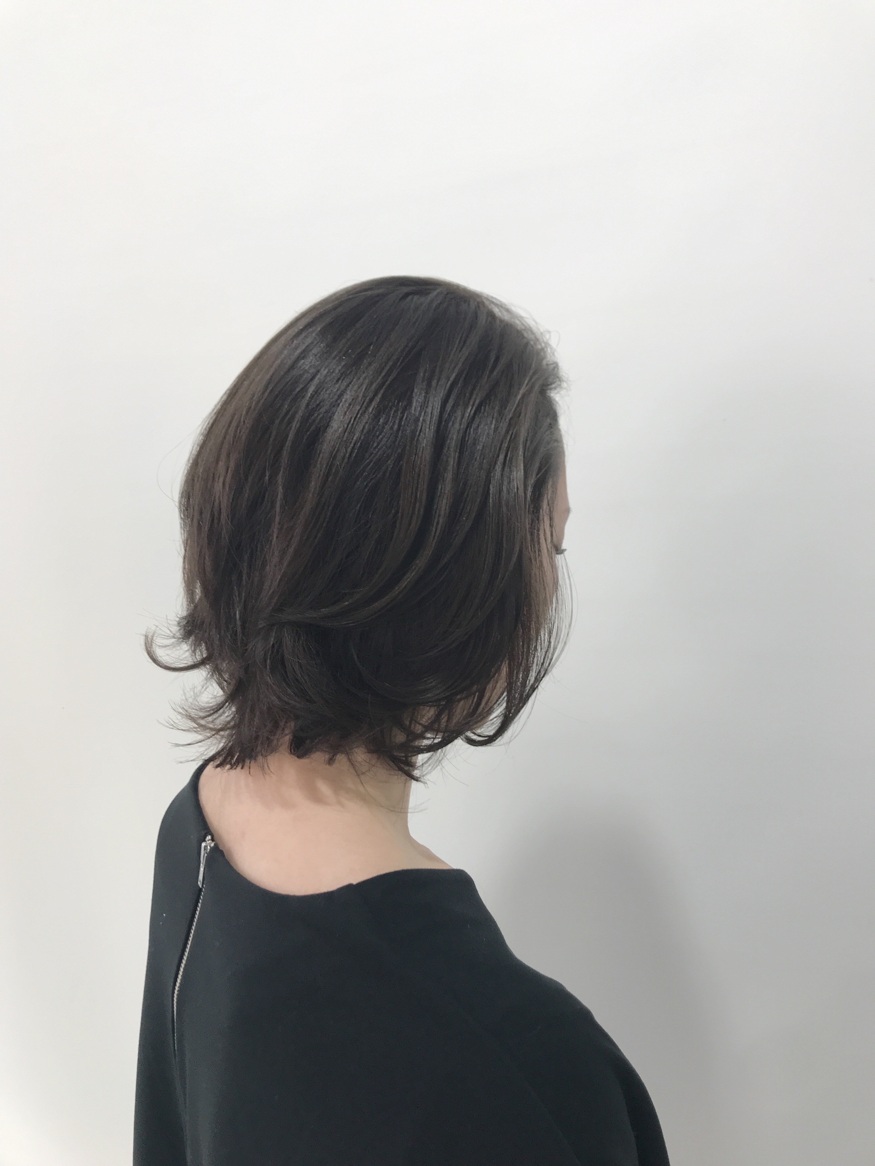 アッシュとベージュのカラーはツヤと透明感があってナチュラルな位置付けにしています。