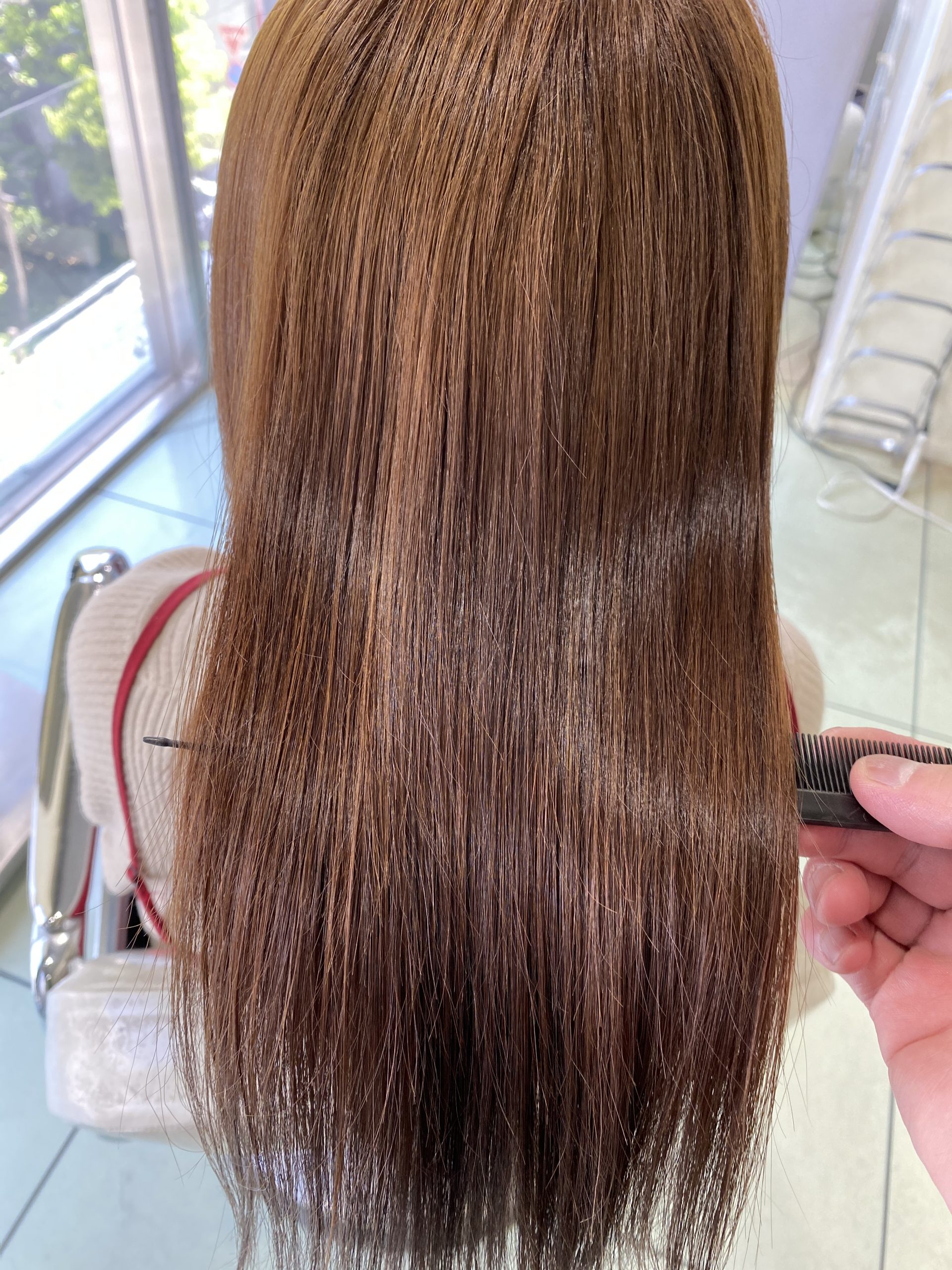 薄っすらとピンクを感じるくらいのピンクベージュカラーですが、カラー施術の前後に髪質改善ケアをする事で“艶”が出やすくなります。