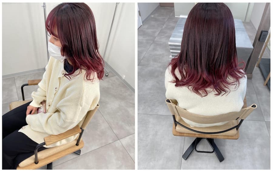 今回は毛先と前髪をブリーチしましてピンクレッドのカラーにチェンジ