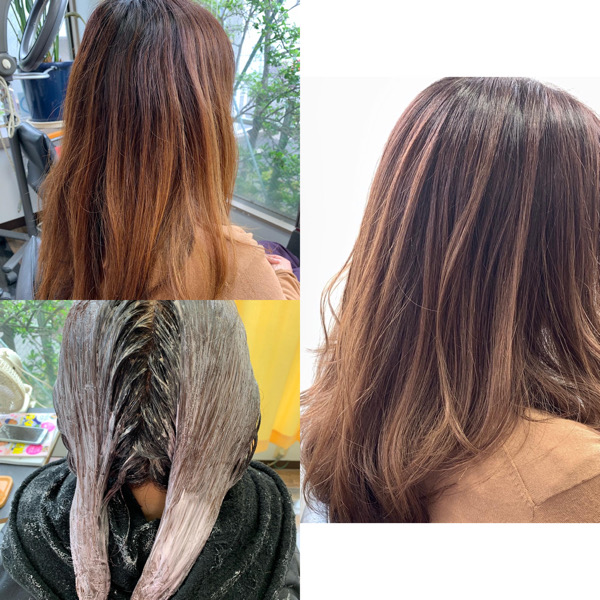 ハイライトが入っているためヘアカラーのみでミルクティーベージュにしていきます