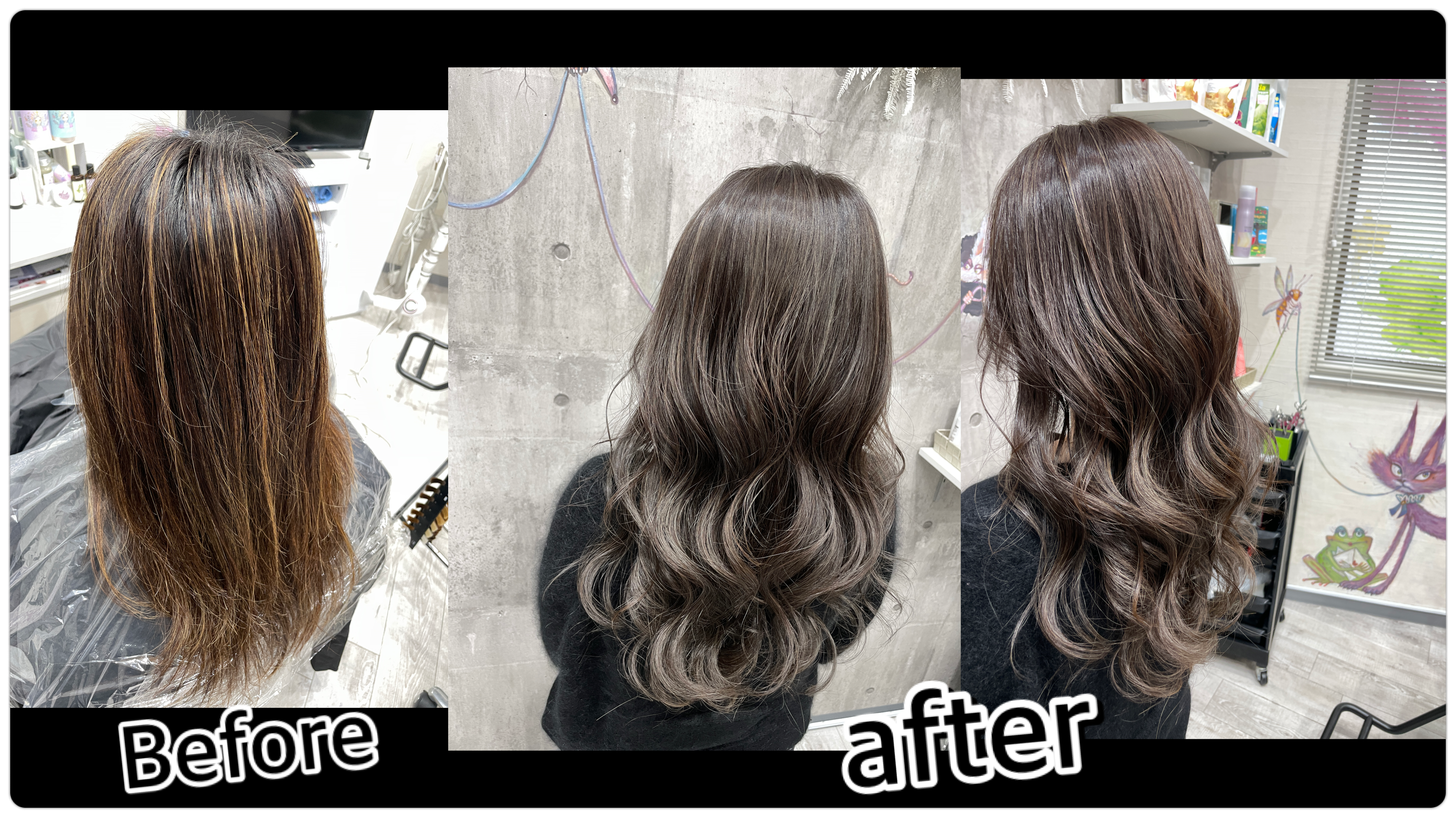 ハイライトのベースに積み重ねでダブルカラーをして脱白髪染めをしています。
