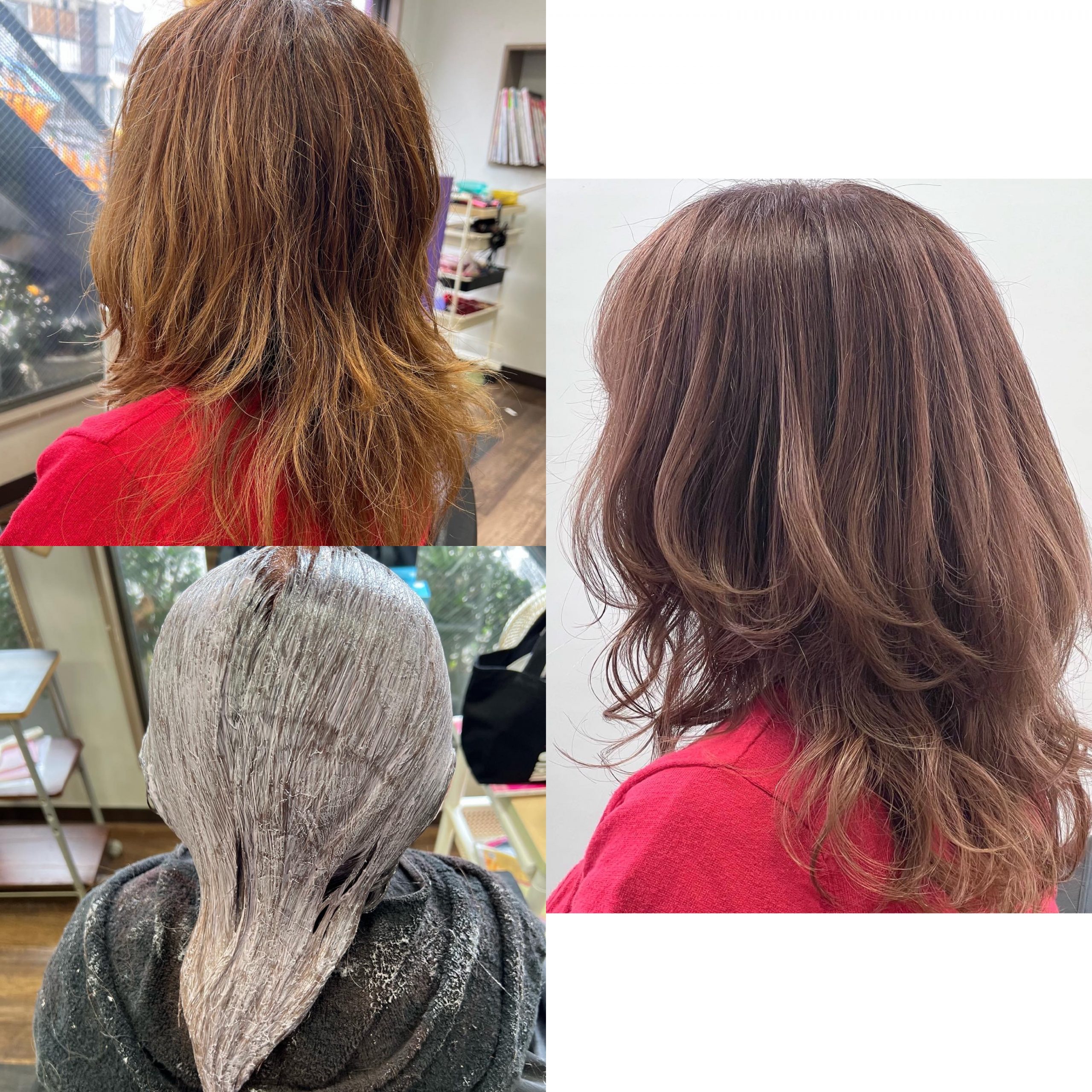 半年前に入れたハイライトを活かしてミルクティーカラーにしていきます