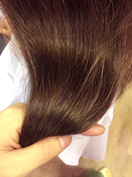 今回は褪色して黄色が出やすい髪の毛に少し明るめのピンクを意識してしてみましたがコンフォートを、少し混ぜる事によってトーンダウンの効果と色に深みが出ます。