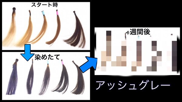 ここでは、実際に毛束をアッシュグレーに染め、色の変化を検証した結果をご紹介します。