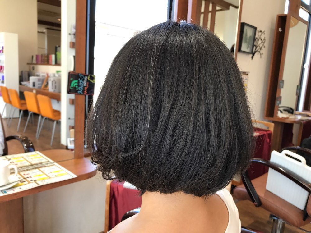 明るくする、色を変えるなどだけがヘアカラーではありません、このような濃いヘアカラーでツヤ髪もおすすめです。