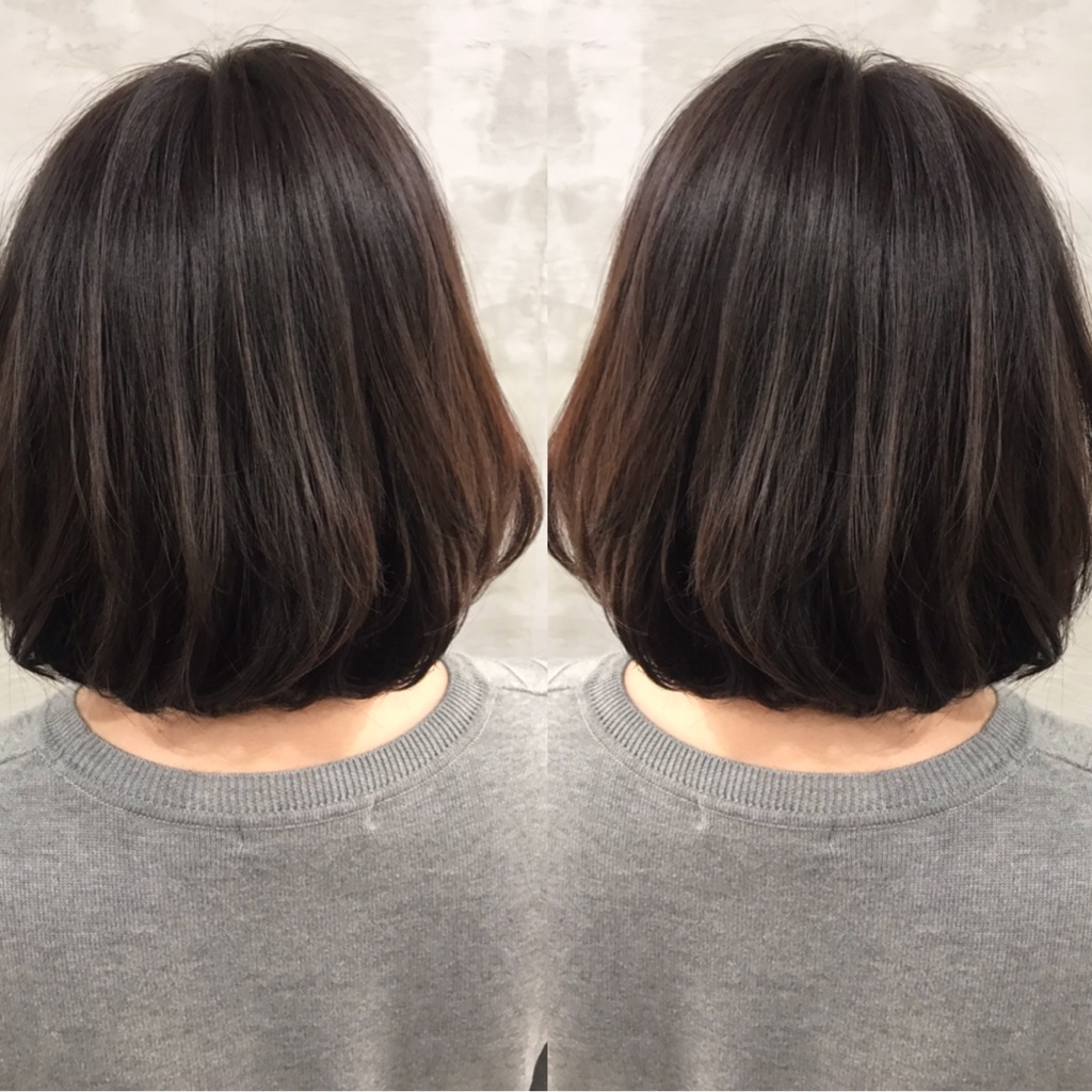 【cut】 平行気味の少し上品なボブ。トップのみ段差を入れた柔らかいスタイルです。ハネずに結べる長さという所もポイントですね。