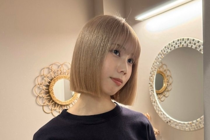 ボブスタイルはホワイトミルクティーとの相性抜群。透明感のあるカラーが、丸みのあるシルエットに軽さをプラスしてくれます。