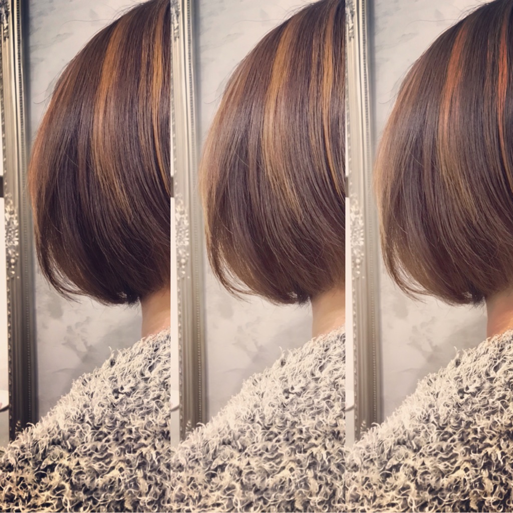 ブリーチにTHROWのブラウンって中々使わないのですが『オレンジ』くらいまで抜けたところにのせるとツヤ感がしっかり出てくれるので、ボブ系など『面』を強調するスタイルには向いてますね。