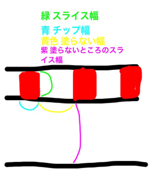 ですが単純に太さといっても、スライス幅、チップ幅、塗らないところの幅、塗らないところのスライスの幅を考えていきます。