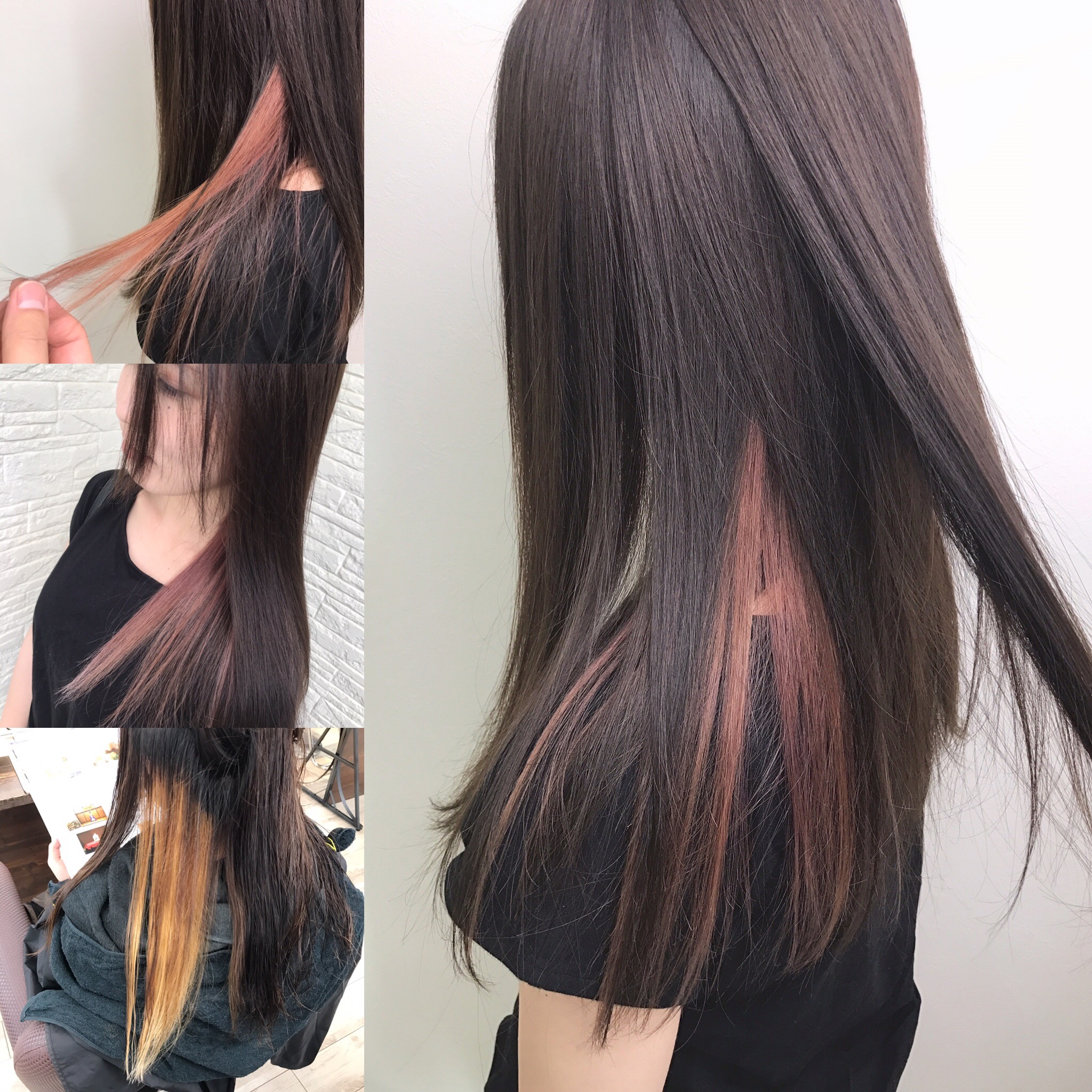 暗めなピンク系カラーにブリーチを使ったシークレットインナーカラー