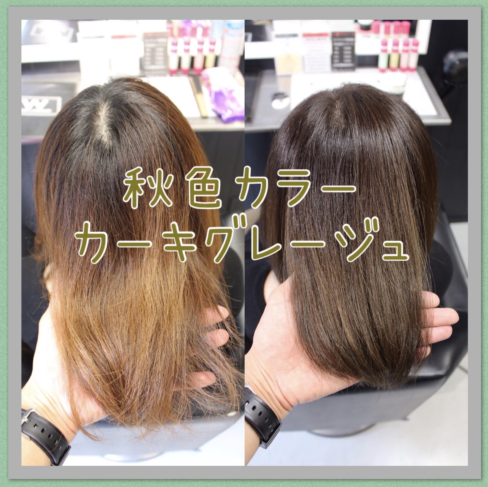 そこのところを考慮してカーキグレージュのカラー剤の選定を行いたいと思います。