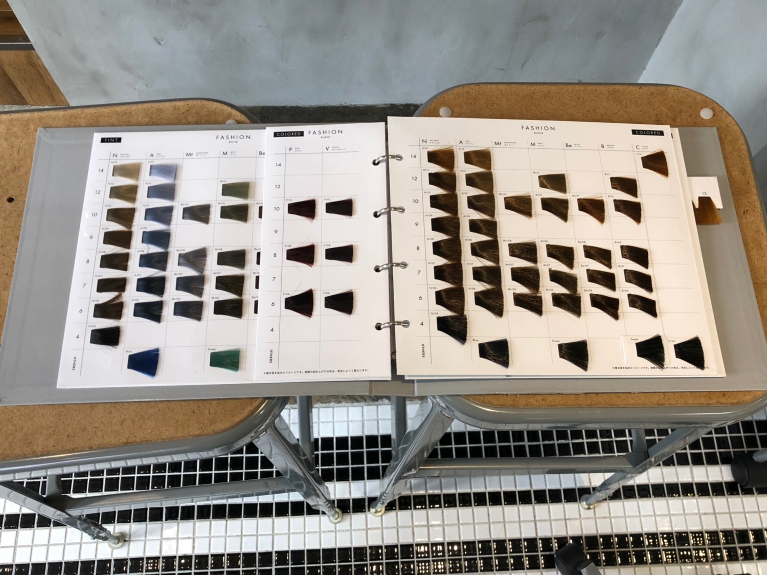 これをお客様にお見せしたり、実際にカラーを作る時に見ながら配合を考えたりします。