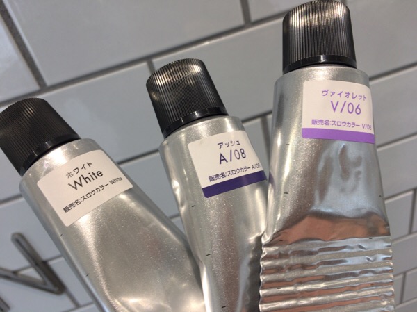 バイオレットとアッシュを混ぜることで赤みを和らげつつ、ホワイトでマイルドに仕上げていきます。