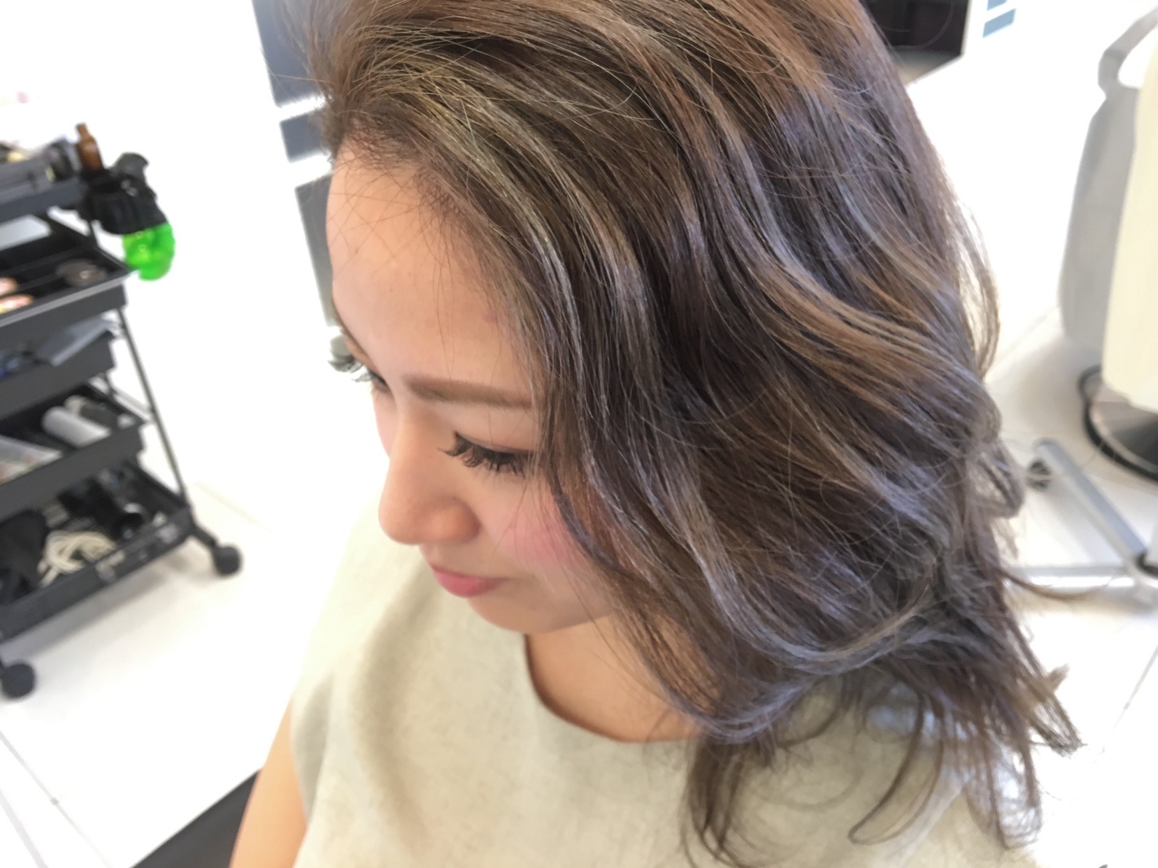 ハイライト部分は黄色味が強くなり、アッシュの影響を受けやすいので、今回はブルー少なめです。