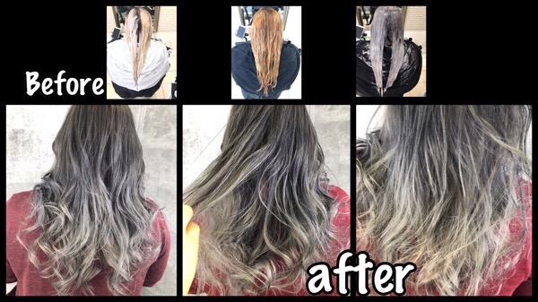 根元付近もブリーチして白髪がグレーに染まるようにしました。
