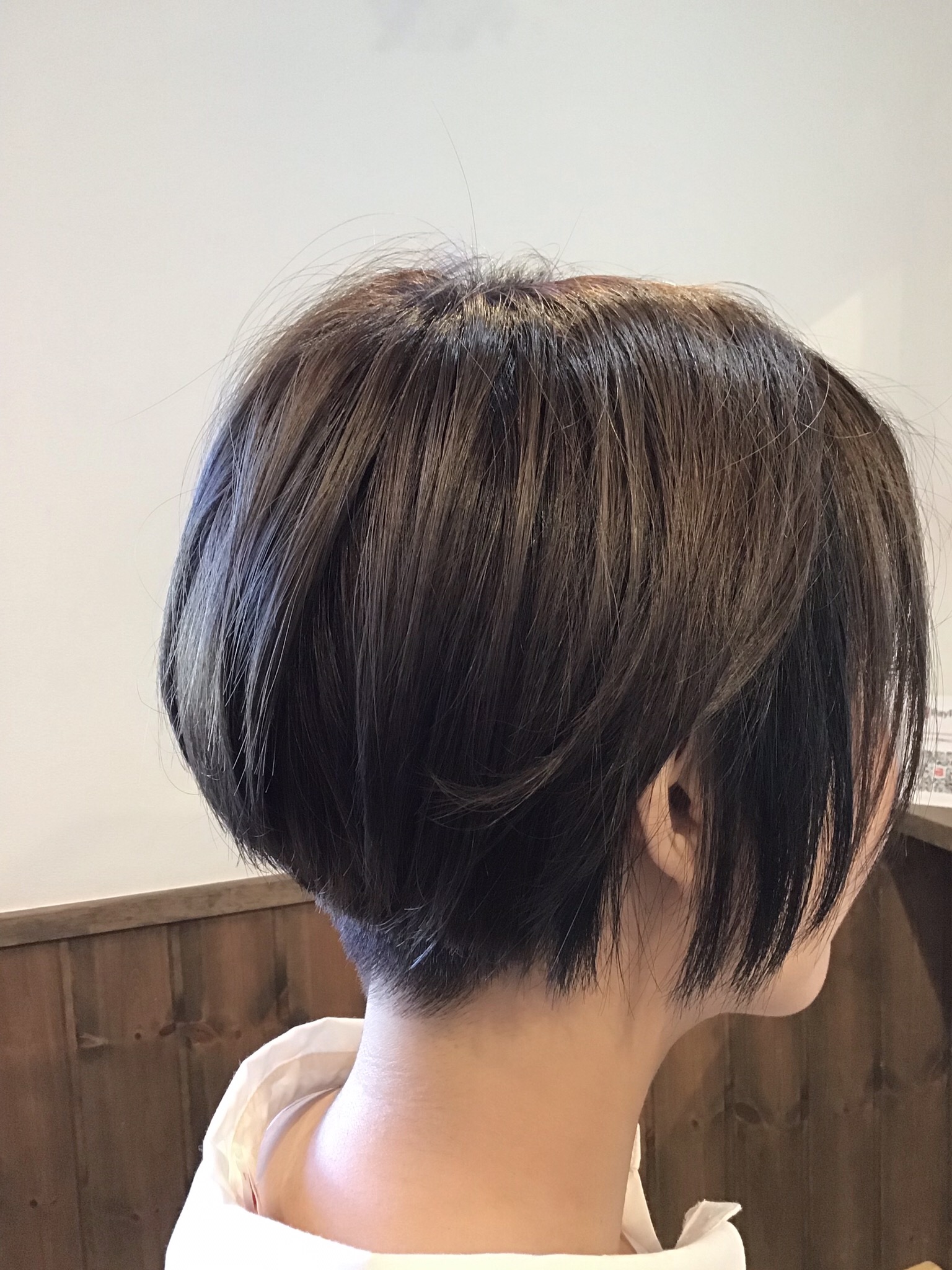 えりあしを刈り上げてスッキリさせながらバックのセンターでナチュラルにつなぎ、後頭部のボリュームを強調。そこからサイドのアウトラインへと前下がりにつなげています。耳後ろにたまりやすい重さも削るためその辺りまで刈り上げているので、やや2ブロック気味になっています!