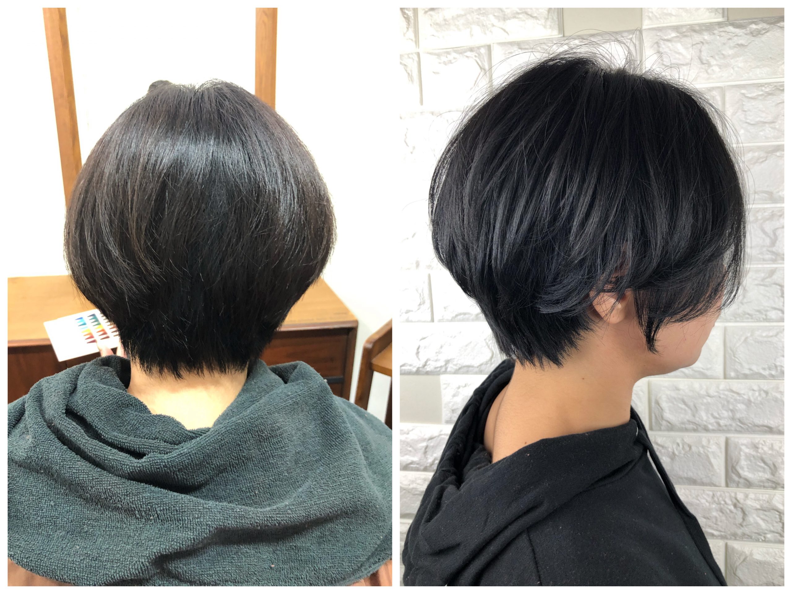 明るさを落として、黒に近いカラーにする場合は、いつもブルーの暗染めをおススメしています!