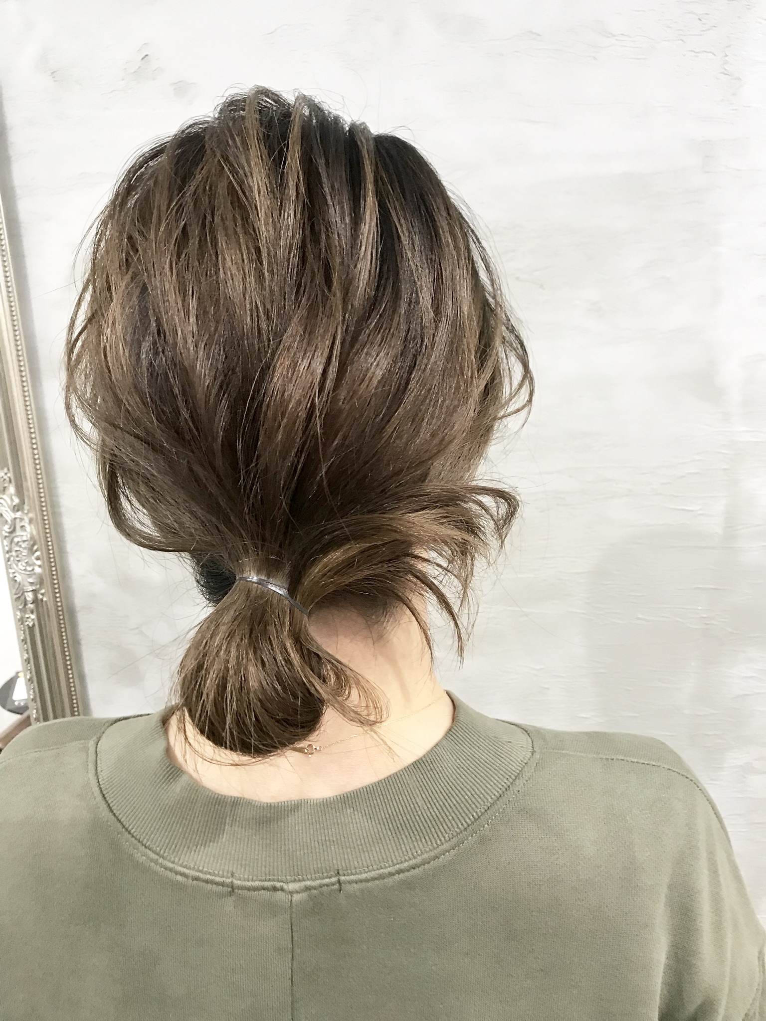 根元と毛先の明度を2レベル程度変えて染めるとナチュラルな奥行きが出ますね。アレンジの際にもこの奥行きがいきてきます。おすすめですよ。ゆるグラデーションカラー。