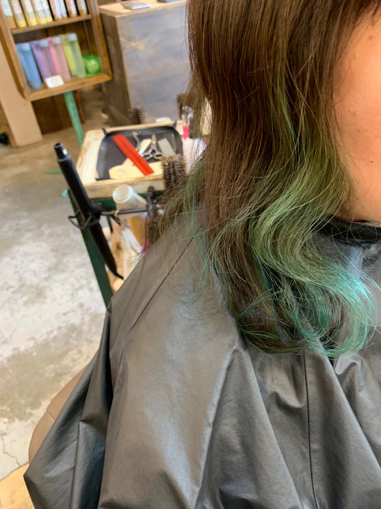 ・ブルー系で染めて約1ヶ月程度、褪色が進み淡い緑みが残ってる。
