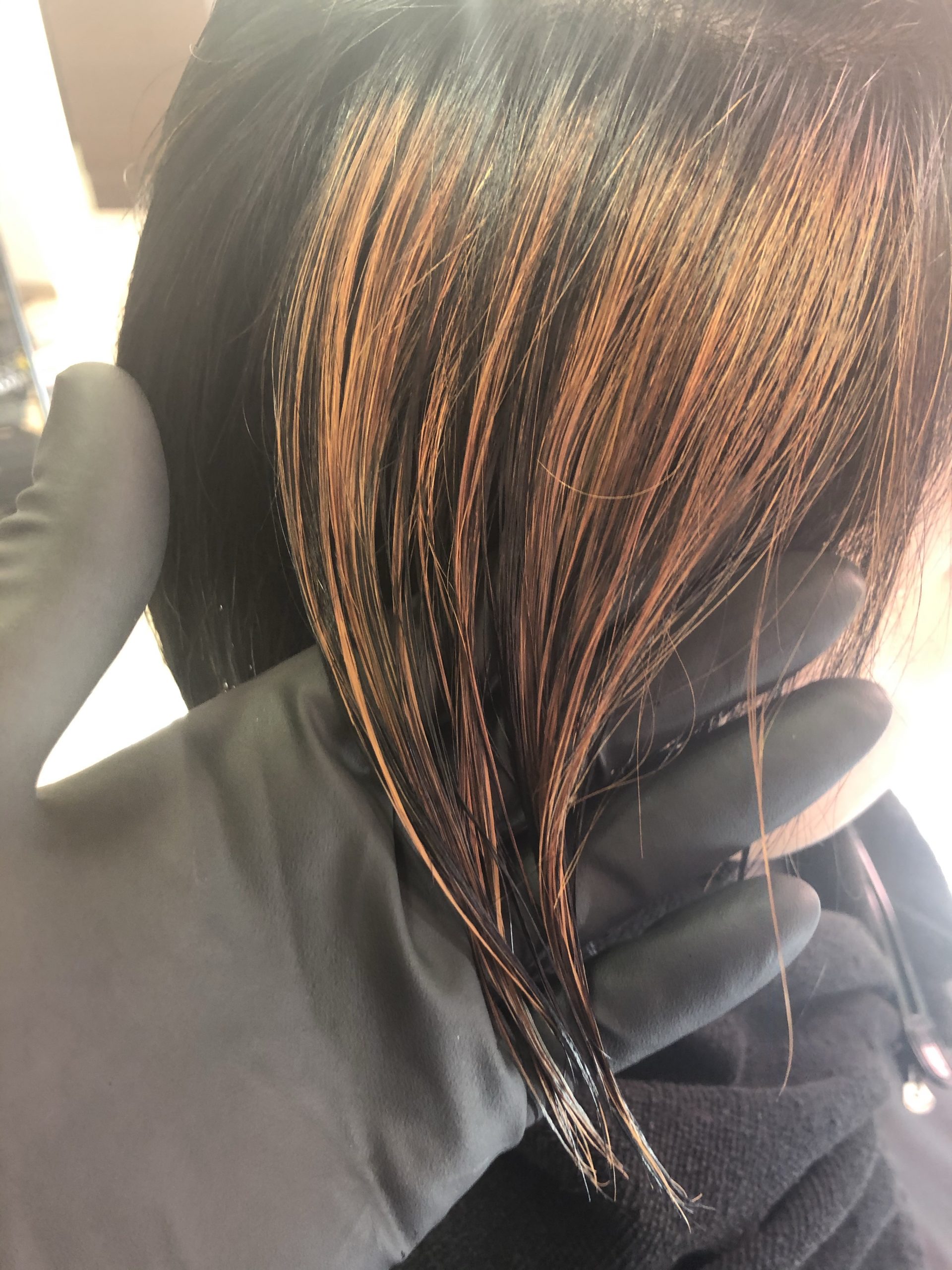 セルフカラーを繰り返してるのと、ダメージしやすいエイジング毛になってきている点を考慮してブリーチは1回目を流さずに重ねてブリーチで約2回にしました。