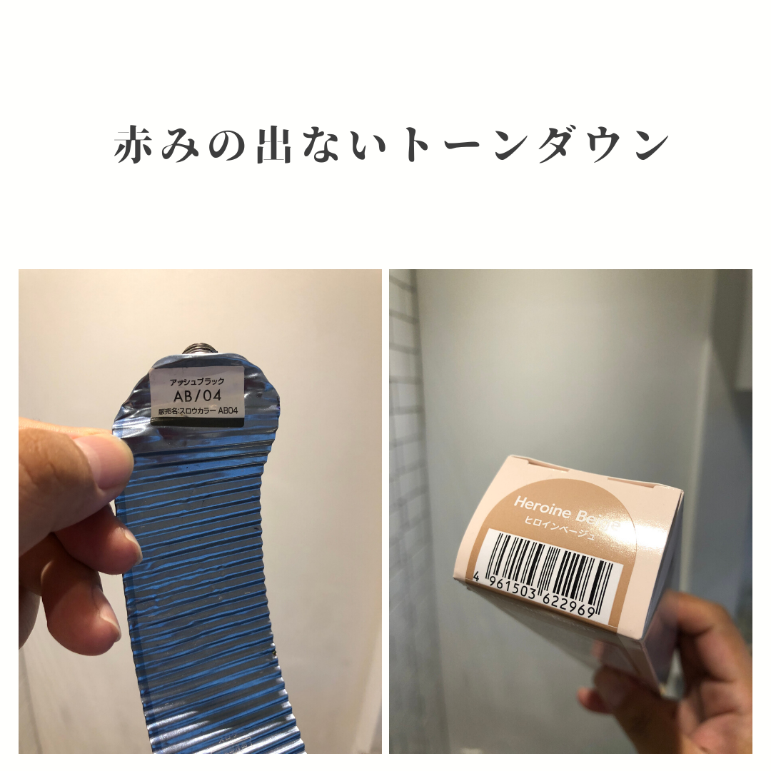 4レベルで赤みのないカラーにヒロインベージュをプラスする事で髪の毛の中に擬似メラニンっぽい色をプラス出来るのでしっとりしつつ柔らかく仕上がるはず…