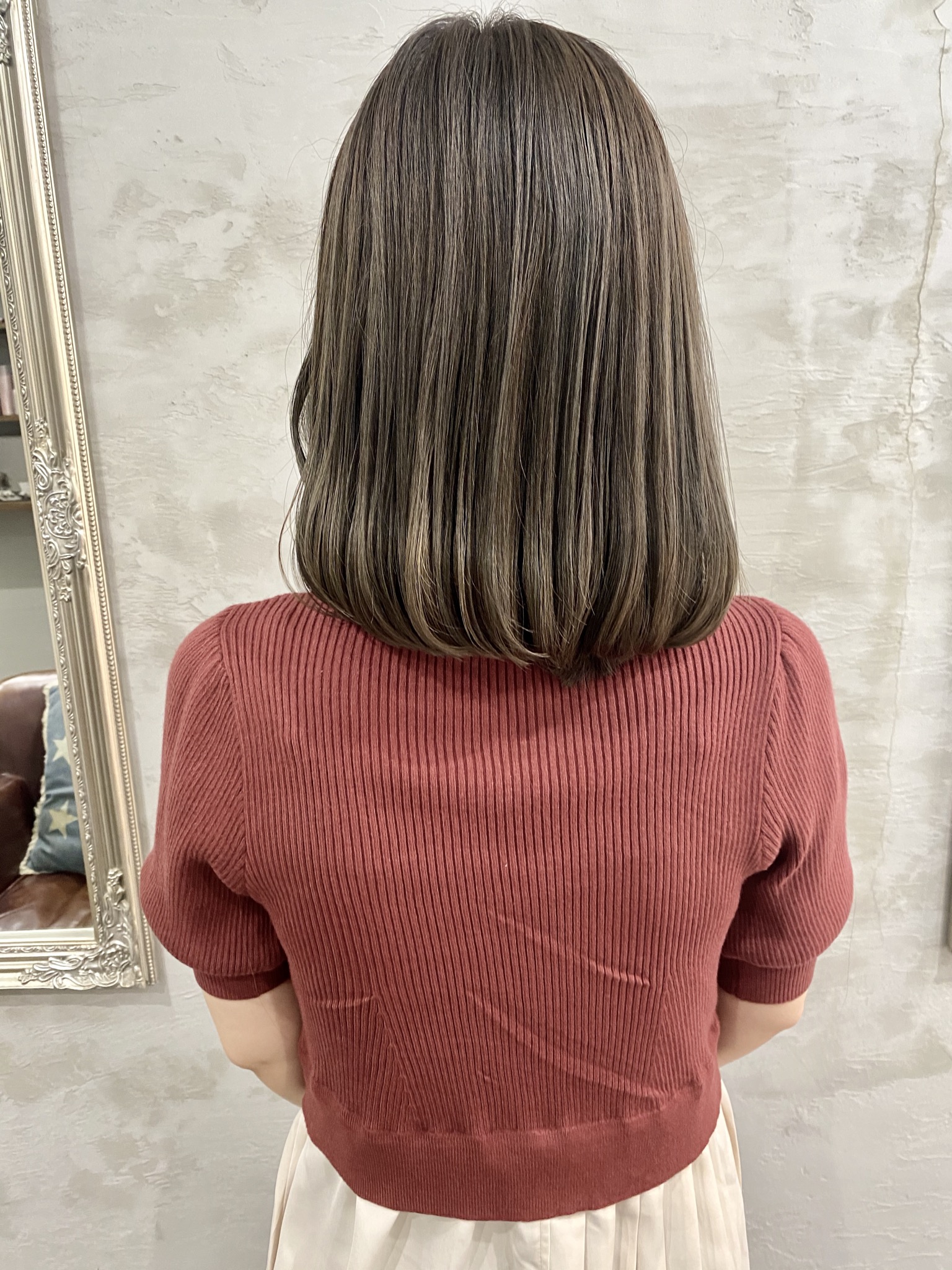 コントラストをくっきりつけないナチュラルな透明感を引き出したい時は塗り分けせずに、ワンタッチで染めると馴染みの良いカラーが楽しめますね。