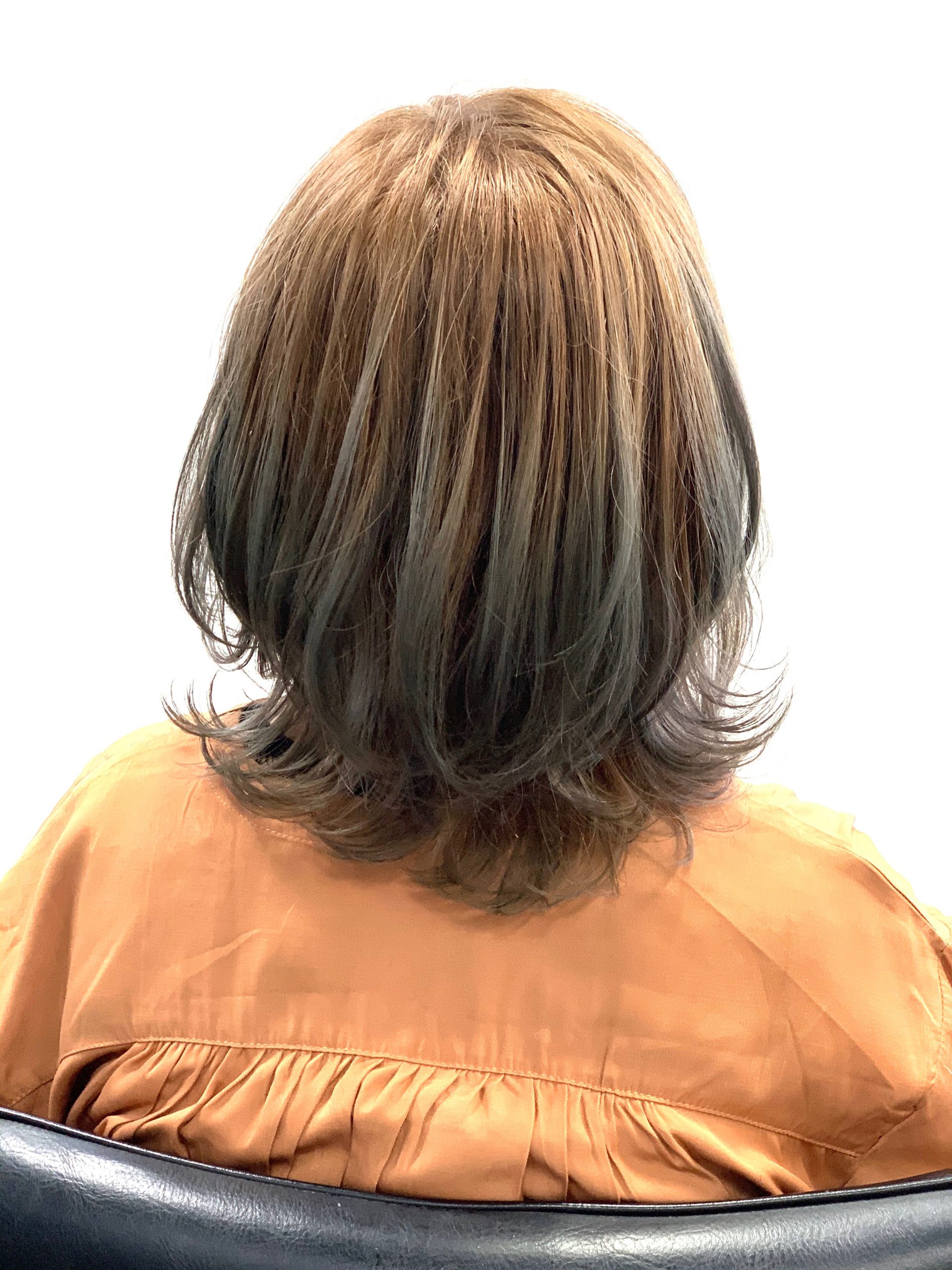襟足付近はグレージュ、ヘナの残留部分は緑味を薄めて、根元付近はミルクティーに。