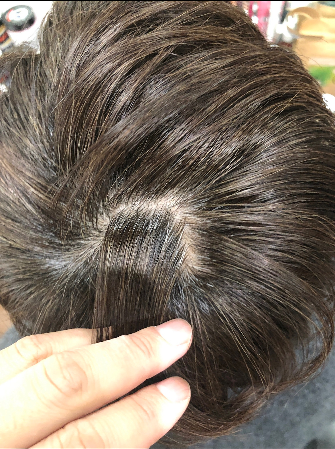 明るい白髪染めで薄く白髪に色をいれてるので馴染みやすいと言う感じです。