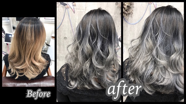 ブリーチの積み重ねが必要になります。 赤みのない土台をつくってから ホワイトシルバーでグラデーションにしました。
