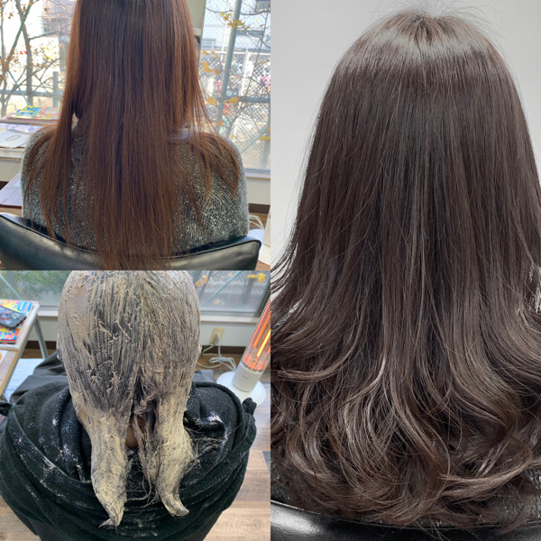 ブリーチをしていない為赤味は残りますが極力赤味を抑えたヘアカラーをご提案。