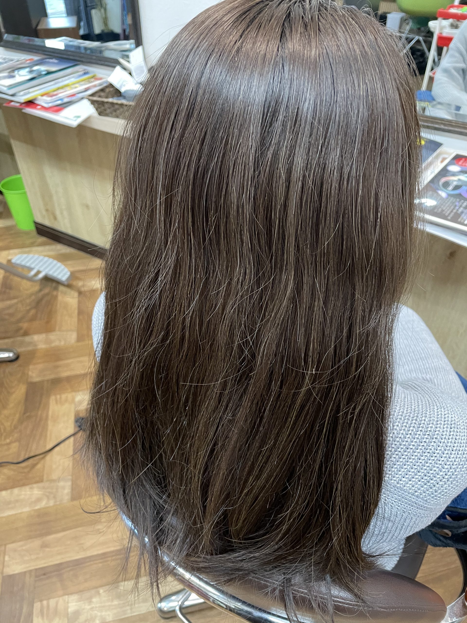 今回のお客様は、2ヶ月ペースで来ていただいているお客様で根元はコンフォートでしっかり白髪染め、毛先はスロウとティントバーで濃いめのブルージュにしています。