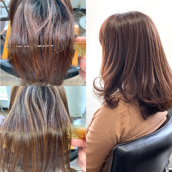 白髪も染まるハイライトを活かしたヘアカラーで赤味を抑えるカラーレシピ