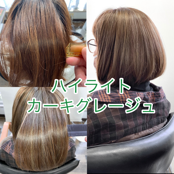 ハイライト部分をグレージュにベースの色味は赤味を抑えるヘアカラー