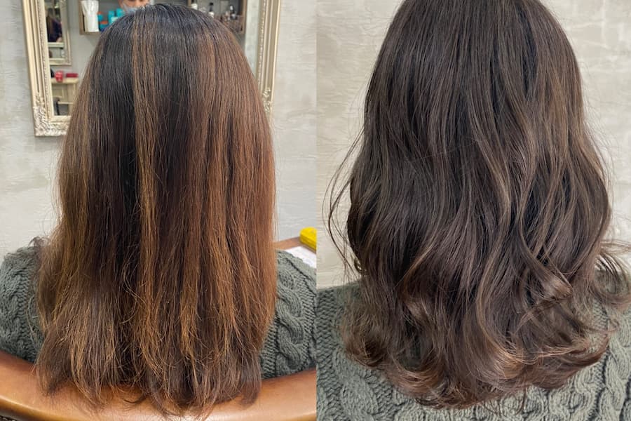 今回はワンブリーチ履歴あり。少しオレンジ味のある所から透明感のあるアッシュ系カラーです。