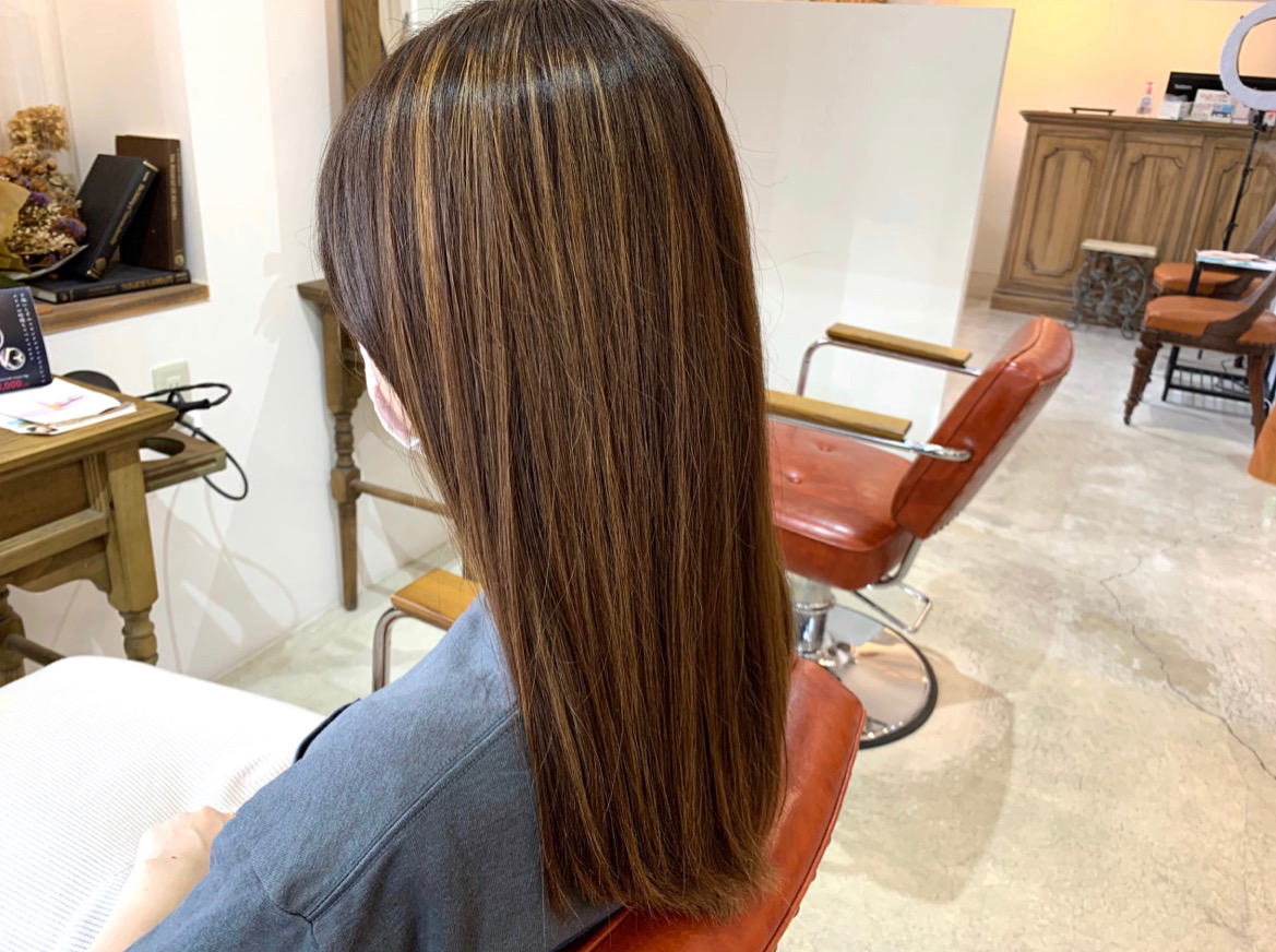 シャンプーをした後、グレートリートメントをつけて5分程時間を置くだけでハイライトの部分に色が入ってくれるのでずっとキレイな状態でいてくれます。