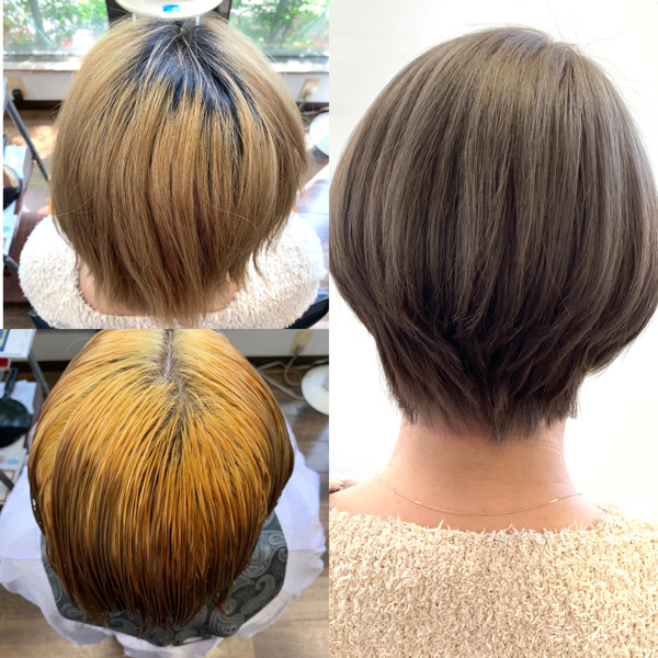 根元のブリーチリタッチから施し黒髪部分をトーンアップ
