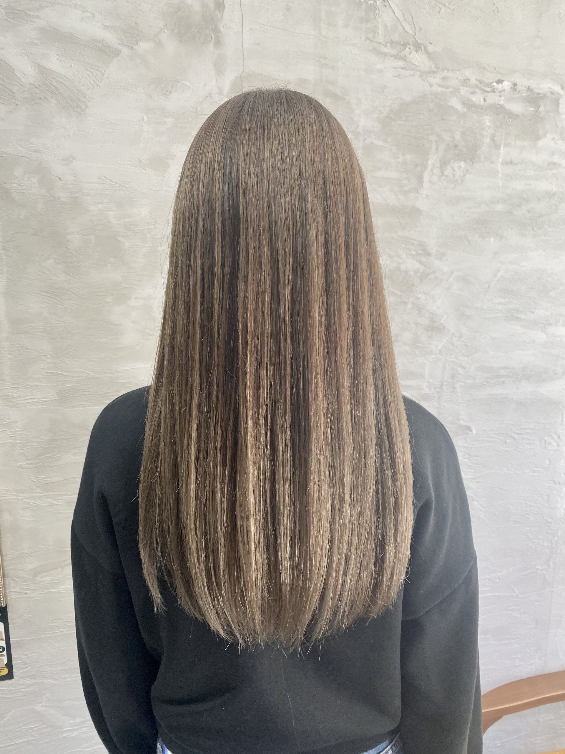 今回は元々ブリーチしている髪の毛につけたしハイライト→オンカラーになります。